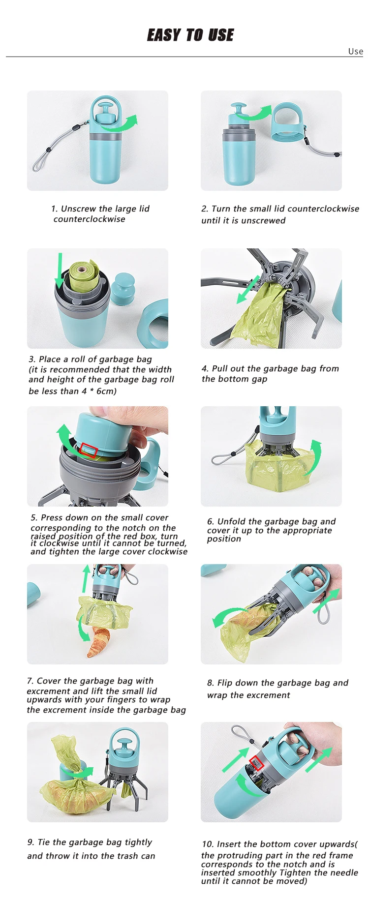 The portable dog pooper scooper features a no-touch design, ensuring your hands stay clean while picking up pet waste.
